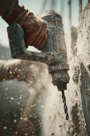 This image captures a close-up view of an electric drill creating sparks and dust during a construction project, showcasing the power and precision of the tool in action.