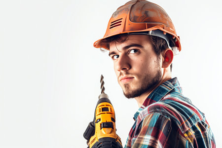Construction Worker drilling a hole with a drill on a white wall. Copyspace.