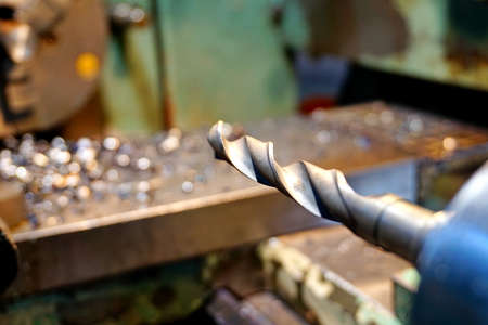 A modern drill for creating holes in metal. Work as a drill in the workshop. Replacing the drill after use. Preparing for work. Background is my hobby. Drill holes in a metal beam.