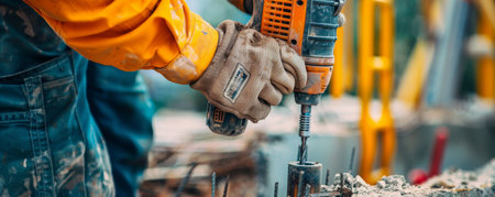 A dynamic scene capturing an electric drill breaking through concrete at a construction site. Dust and gravel fly as a worker operates the machinery, emphasizing labor and innovation.