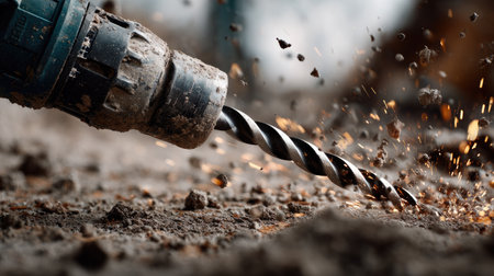 A dynamic close-up view of an electric drill in action, featuring a spiral bit creating sparks and dust at a construction site, showcasing power tools.