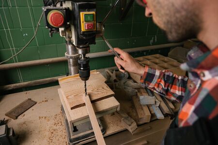 Working process in the carpentry workshop.A man in overalls works in a carpentry workshop.A man drills wooden board with a drilling machine.Profession, carpentry, woodwork and people concept