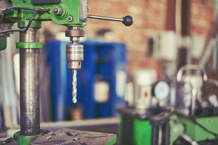 wood factory with industrial drilling and milling tool. Old furniture factory with vintage tools