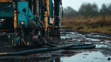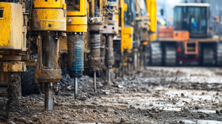 Image of drilling machinery lined up at a construction site, highlighting tools in action as they dig into the muddy ground for urban infrastructure projects.