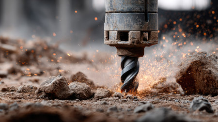 This close-up image captures a drill bit in action, creating sparks as it penetrates the ground at a construction site. The blurred background adds depth and highlights the dynamic energy of the industrial process.