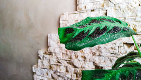 potted houseplant calathea maranta leuconeura with waterdrops in front of a gray artificial stone wall