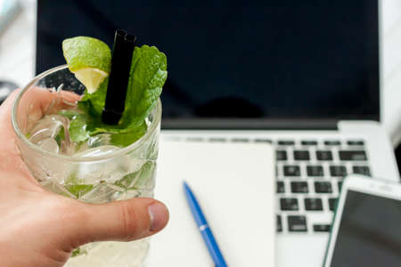 Close up of hand holding stylish glass with non alcoholic beverage and condensation.