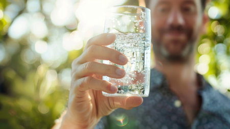 A man holds up a glass of sparkling spring water admiring its crystal clarity