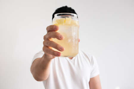 Hand pour fresh water into a glass with ice - thirsty refreshment cold drink concept