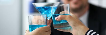 Colleagues in office celebrating significant event with blue alcoholic liquid in glasses