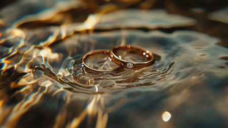A close-up of a pair of gold wedding rings resting in a shallow water pool, with light reflections