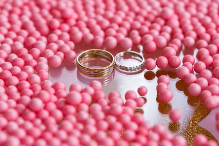 Yellow and white gold wedding ring with diamond. pink balls and bubbles background. Original tray for the ceremony of marriage