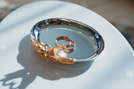 Pair of shiny wedding rings on silver plate in church holding by male hand on blue background