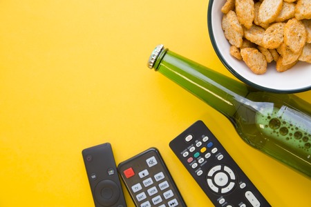 Weekend, hobby and leisure concept. A one-color yellow background with a bottle of cold lager beer, a bowl of salty bread crumbs and three tv remote controls. Space for your text or image.