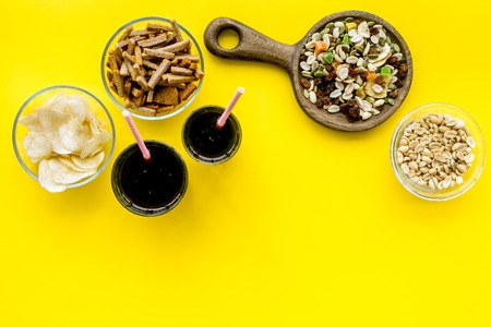 Snacks for TV watching. Chips, nuts, soda, rusks, dried fruits on yellow background top view copy space