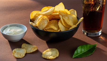A tempting arrangement of crispy potato chips in a bowl, accompanied by a creamy dip and a refreshing glass of cola, perfect for a snack.