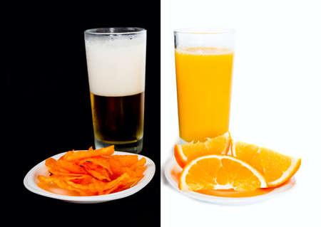 Choose a snack - healthy eating carrots with juice or harmful food chips with cola. Food in the break between working on a laptop