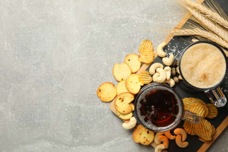 Beer, wheat and snacks on gray background