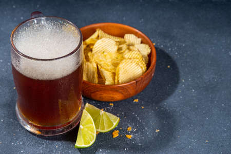 Beer and potato chips. Glass of light beer. Chips, nuts, crackers are good for a snack on dark marble. Good for beer festival, pab, restaurant advertising. Food and Drink.