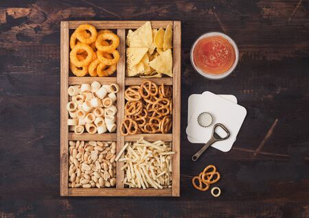 Glass of craft lager beer and opener with box of snacks on wood background. Pretzel,salty potato sticks, peanuts, onion rings with nachos in vintage box with openers and beer mats.