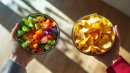 Healthy salad and crispy potato chips held in hands against a bright background during daylight