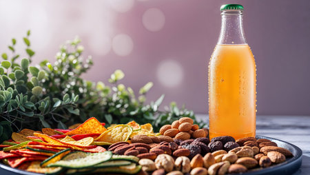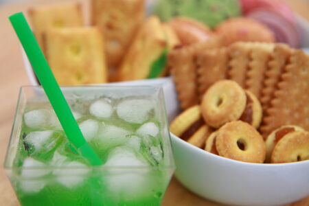 Assorted snacks and a refreshing drink displayed on a table with a blurred background