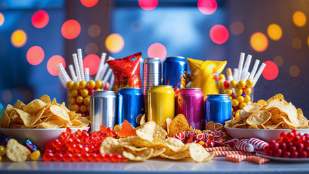 Colorful party snacks and drinks arranged on a table with festive decorations for a lively gathering