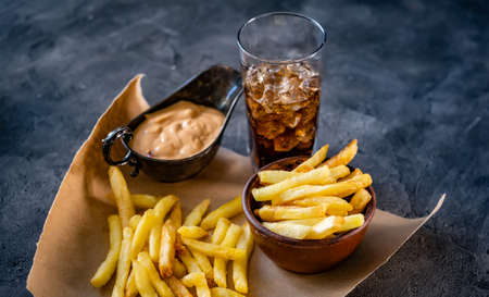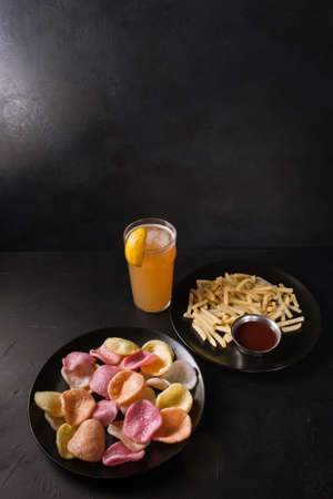 French fries, potato chip snack and a glass of cola. Food and drink concept.