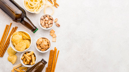 Beer, chips and breadsticks on a table from above. Popular bar snacks. Copy space on the left.
