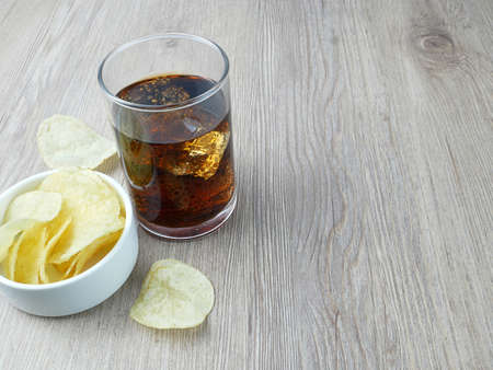Soft drink and potato chips on wood background.