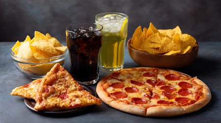 Indulge in a vibrant snack spread featuring pizza drinks and nachos for a perfect home gathering.