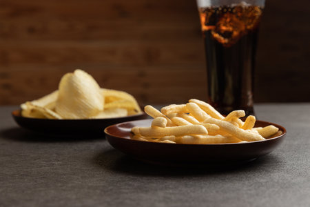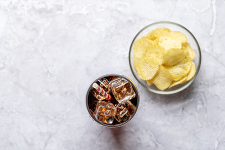 Refreshing glass of cola with ice, accompanied by a serving of crispy chips. On stone table with copy space. flat lay