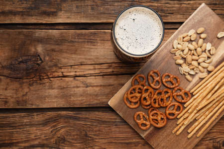 Glass of beer served with delicious pretzel crackers and other snacks on wooden table, flat lay. Space for text
