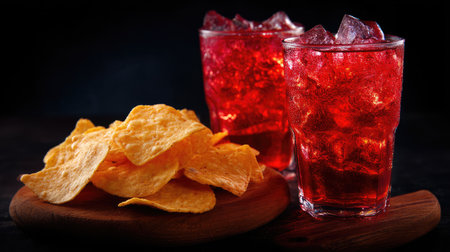 This image features two glasses of vibrant red beverage with ice cubes, accompanied by a pile of crunchy snack chips on a wooden plate, perfect for gatherings.