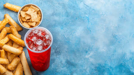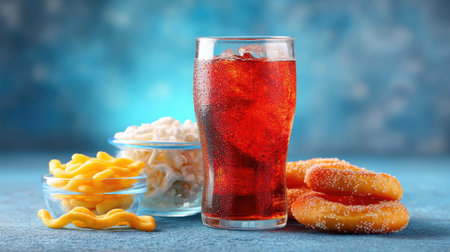 A refreshing glass of soda alongside crispy snacks like popcorn and sweet donuts, set against a vibrant blue backdrop, perfect for food photography.