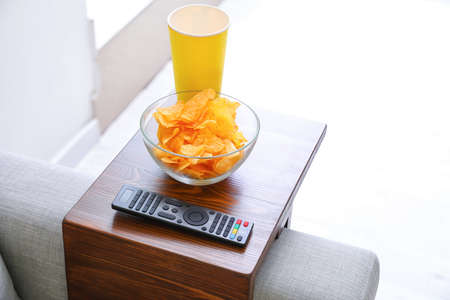 Bowl with chips and remote control on armrest table in room