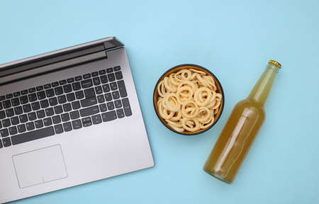 rest time. Laptop, bottle of beer and a snack on a blue background. top view