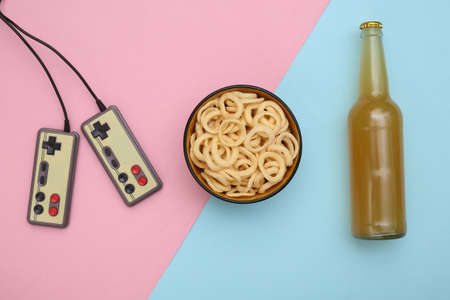 entertainment time. Gamepads and snack bowl, beer bottles on pink blue pastel background. top view