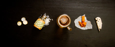 Beer set - cover, beer and crackers in ketchup. Top view