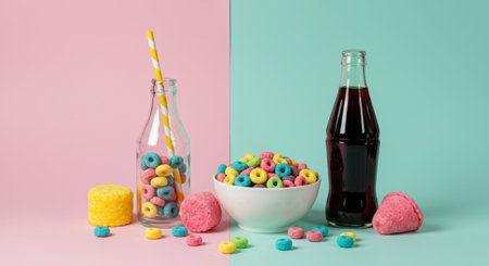 Colorful cereal, marshmallow pops, and soda bottle on a split pink and teal background. Fun, vibrant still life representing sweet treats and child...