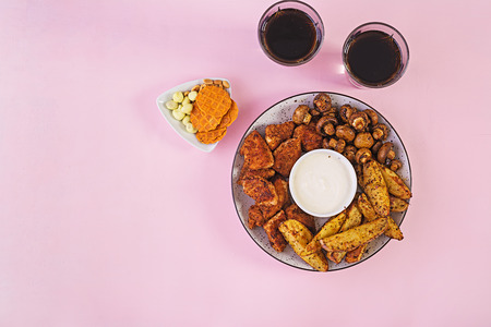 Fast food chicken nuggets with ketchup, french fries, baked mushrooms and cola. Top view