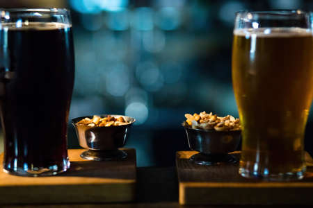 Close up top view of unfiltered dark and light beer in glasses with snacks on a brown wooden table o