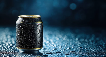 A dark beverage can glistens with condensation, resting on a wet, reflective surface with a dark, moody background.