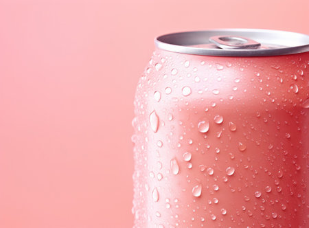 Vibrant pink beverage can placed against a textured pink background with droplets of water reflecting light. Generative AI
