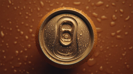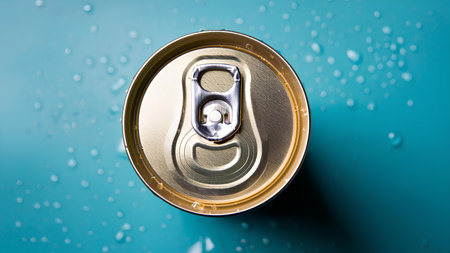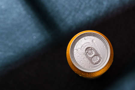 Opened can of beer or soda water with golden coloured aluminium top. Close-up view from high angle with copy space