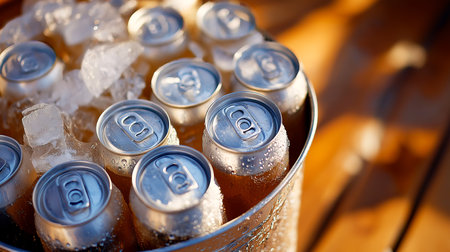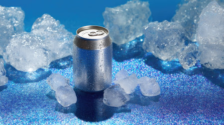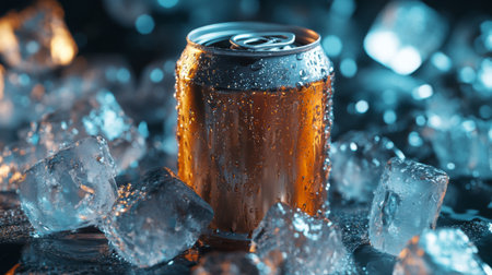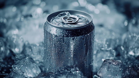 A chilled can of cold drink, surrounded by ice cubes, condensation on the surface, evoking a refreshing coolness.