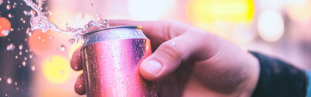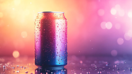 A colorful beverage can glistens with droplets capturing the essence of refreshment in an artistic light.