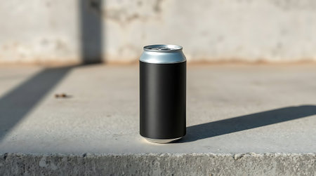 Modern black aluminum can mockup under bright sunlight ready for your beverage packaging design. Perfect for showcasing your brand with a sleek, minimal style.