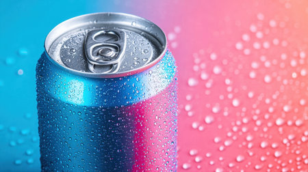 A close-up image of a cold beverage can covered in droplets, set against a vibrant blue and pink background, evoking a refreshing and appetizing vibe.