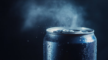 A dramatic shot of a soda can being opened, with carbonation mist escaping in slow motion, against a dark moody backdrop.